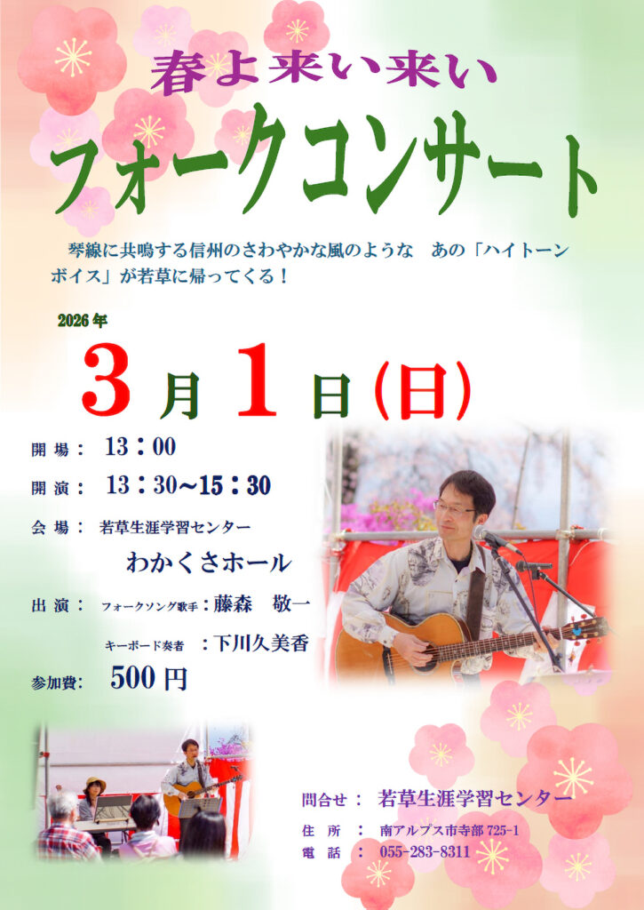 若草生涯学習センターでは、3月1日(日)13:30~15:30 に「春よ来い来い フォークコンサート」を開催いたします。
